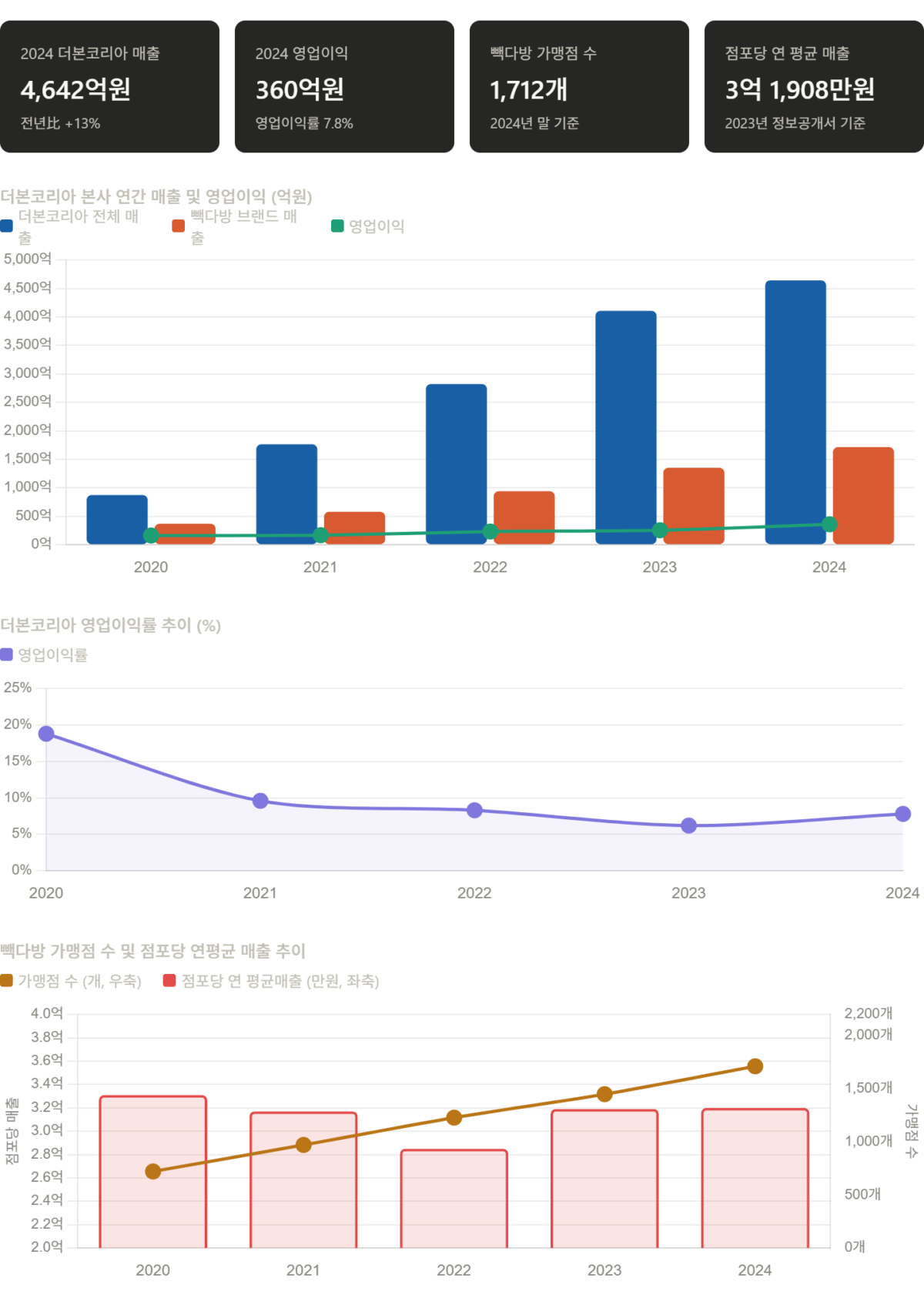 빽다방의 연간 평균 매출액은 2021년 약 2억 8천만 원에서 2024년 말 3억 2,448만 원으로 우상향 중입니다. 하지만 매출이 전부는 아니죠.